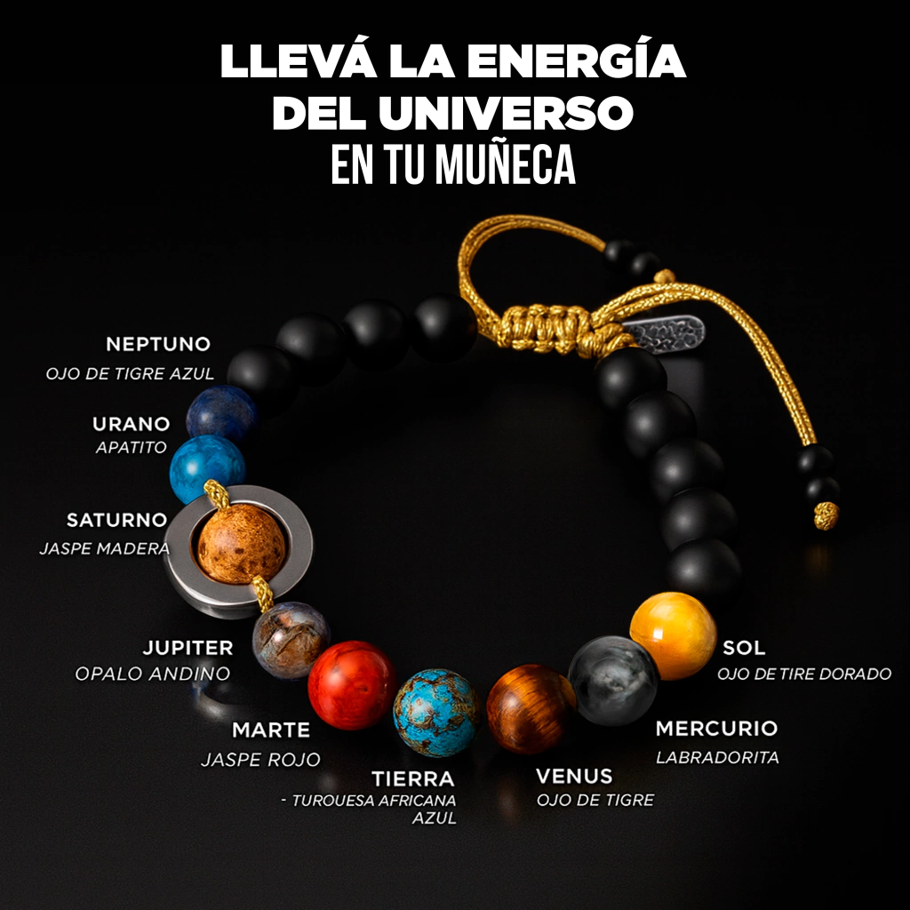 Descubre nuestra Pulsera Universe, una joya única que te conecta con la esencia del sistema solar. Cada piedra ha sido cuidadosamente seleccionada para representar a los planetas, creando un accesorio no solo estético, sino también lleno de simbología.