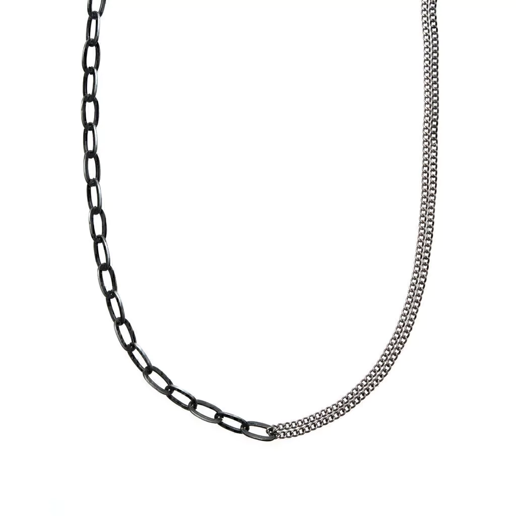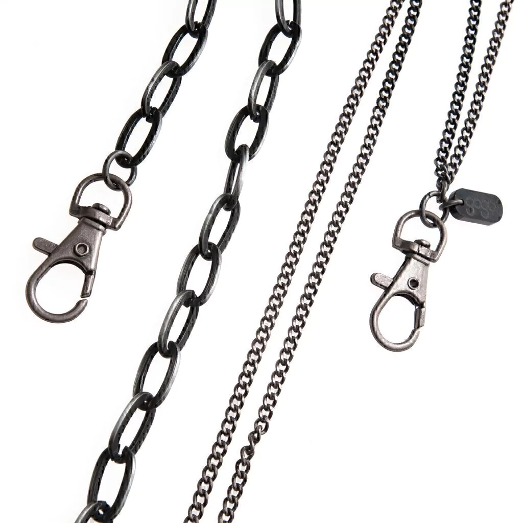 Cadena para cantalón diseñada con dos cadenas de metal fundido color plata vieja, una con eslabones de 10mm y la otra cadena doble con un grosor aproximado de 3mm.