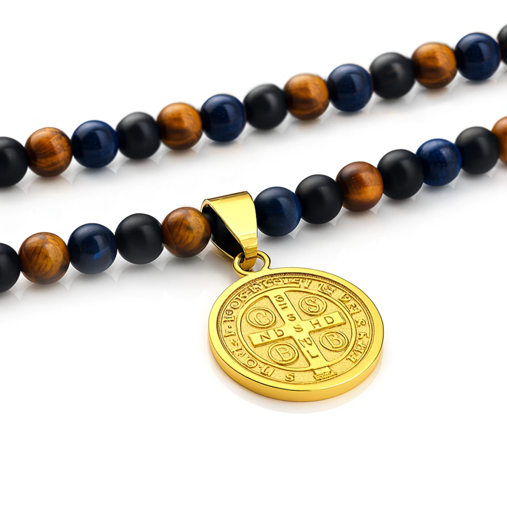 Como toque especial, incluye un dije dorado de San Benito, que no solo añade un detalle llamativo, sino que también es un símbolo de protección y buena fortuna.