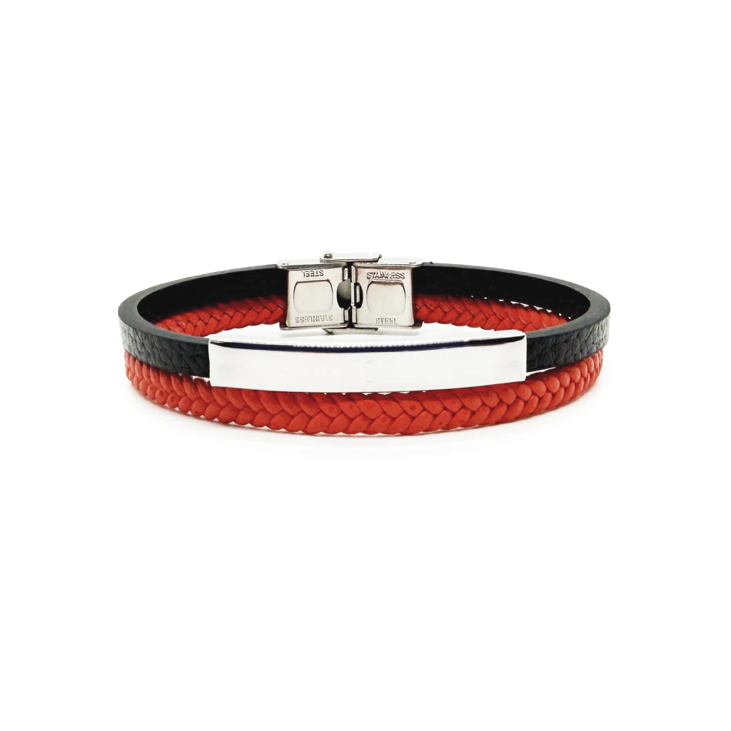 Eleva tu estilo con nuestro Brazalete Eneas, una pieza única que combina elegancia y personalización. Este brazalete está confeccionado con doble tira de cuero: una tira negra y otra trenzada de color rojo, que aportan un contraste vibrante y sofisticado.