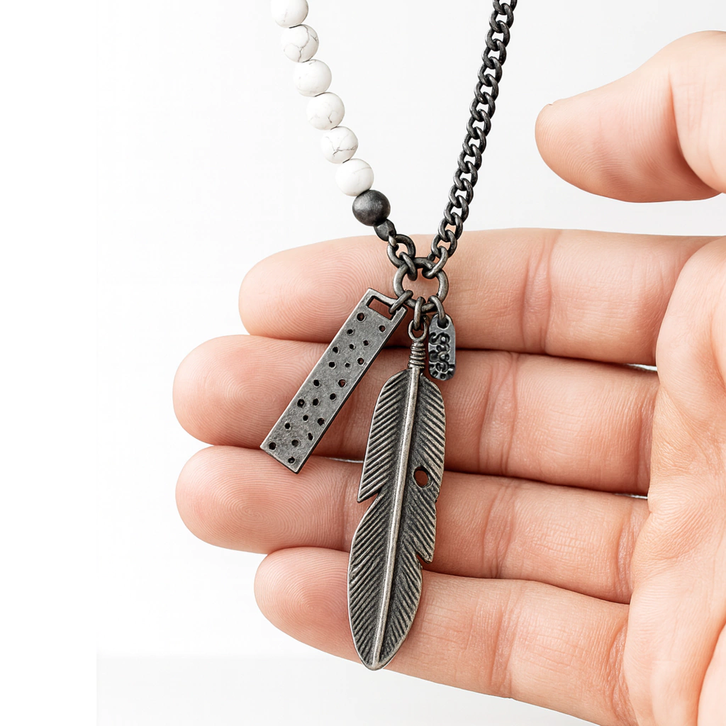 Descubrí el Collar Seúl, un accesorio pensado para hombres que quieren destacar con un estilo urbano y moderno. Su diseño combina la robustez del metal fundido con la elegancia natural de las piedras howlite, otorgándole un toque único y exclusivo.