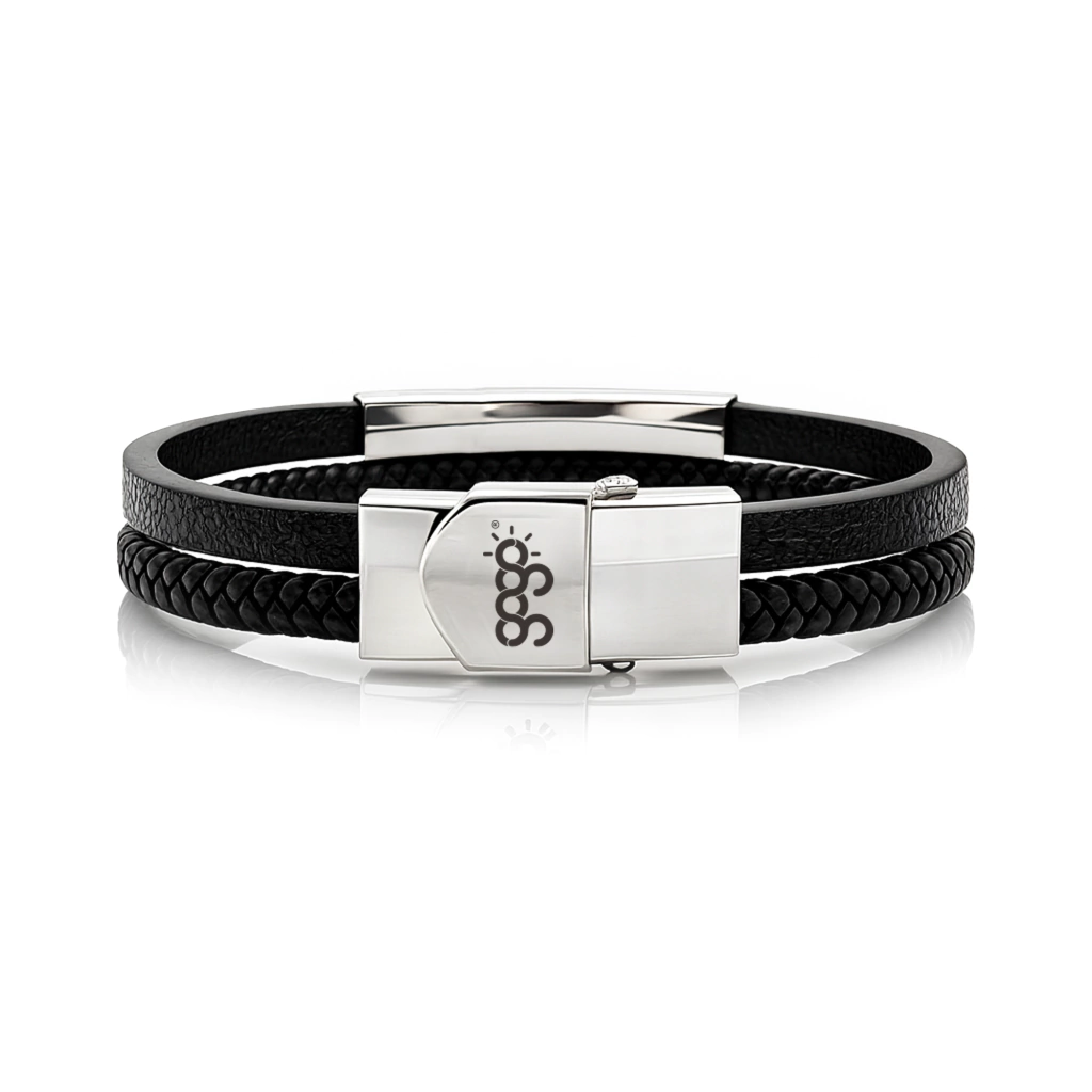 El brazalete esta hecho de cuero color negro con pasador central en acero quirúrgico es una pieza única y elegante que combina la robustez del cuero con la sofisticación del acero. El pasador central y los detalles en acero quirúrgico le confieren un estilo moderno y refinado, mientras que el cierre tipo hebilla con gancho de seguridad garantiza un ajuste seguro y cómodo en tu muñeca.
