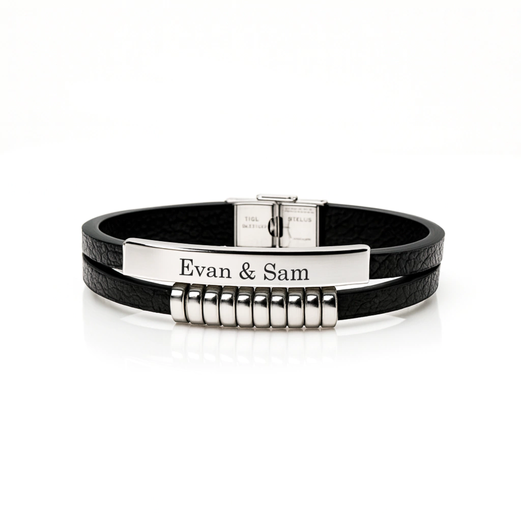 Este brazalete está confeccionado con cuero genuino color negro, destacando por su diseño de doble tira: una con donas de acero quirúrgico y otra con una chapa central del mismo material, que podés personalizar mediante grabado láser con el texto que elijas, logrando un toque único y exclusivo.