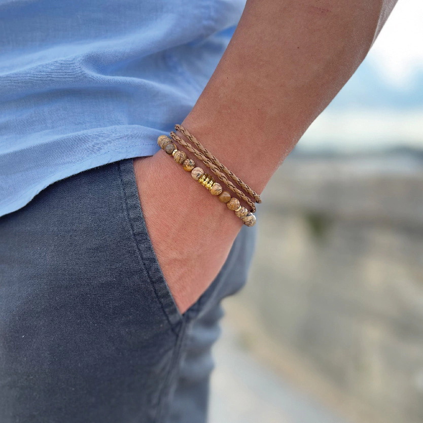 Pack de 2 pulseras, una diseñada en rocas jaspe madera de 6mm, combinada con arandelas y un dije central tallado en oro golfie, contruida en elástico resistente de 1mm.
