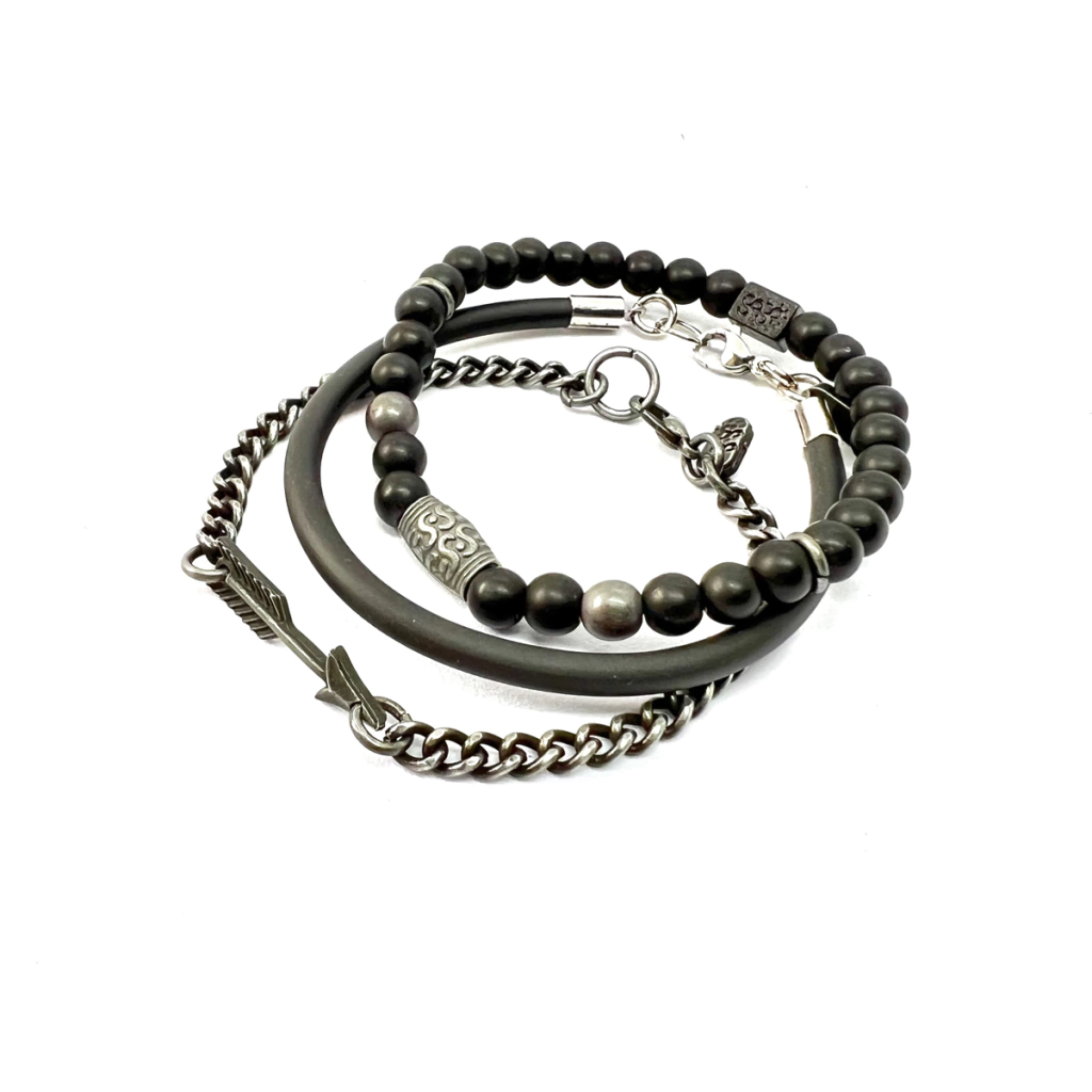 Pulsera 1: Rocas Ónix Mate y Hematite Mate de 6mm, combinada con arandelas y un cilindro tallado en el centro en metal fundido con acabado envejecido.