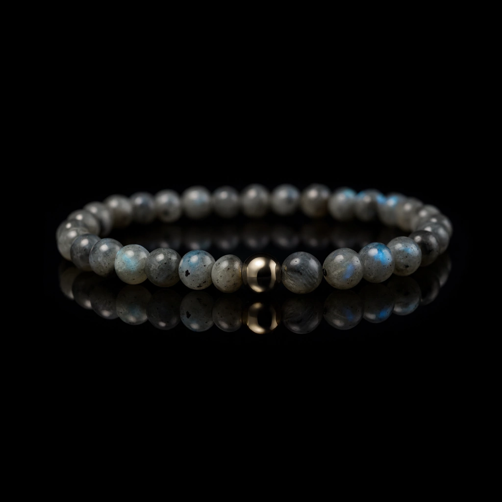 Diseñada con rocas labradorita mate de 6 mm y bolita de oro blanco de 18 kilates y de la misma medida.